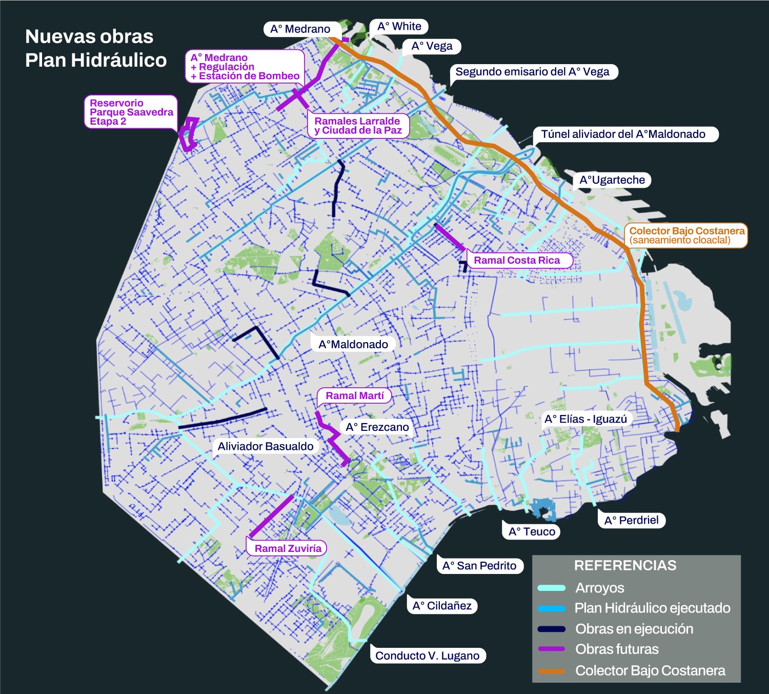 Entre las obras destacadas se encuentra la segunda etapa del reservorio del Parque Sarmiento, ubicado en el barrio de Saavedra. Esta infraestructura se vale de soluciones basadas en la naturaleza para retener el agua de lluvia y prevenir inundaciones. También se avanzará con el desarrollo de ramales claves en distintas subcuencas.