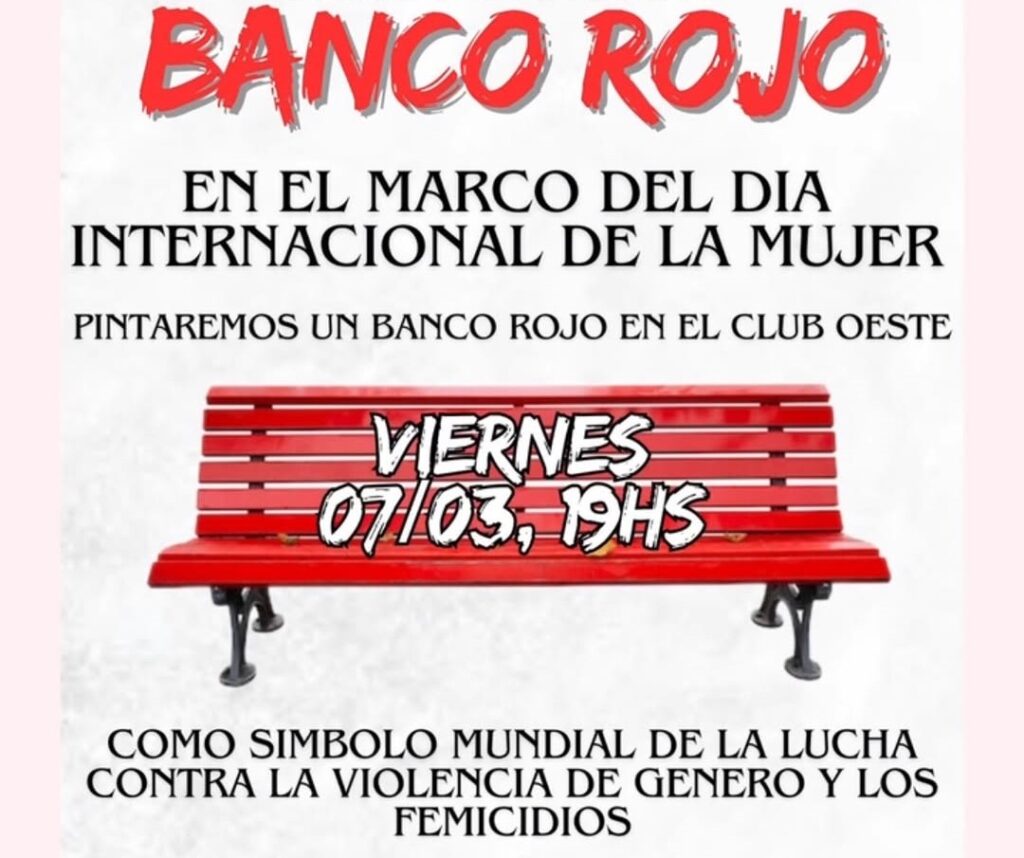 El viernes 7 de marzo a las 19 horas se inauguró un Banco Rojo en el Club Oeste, ubicado en José María Moreno 446, en el barrio de Caballito. La convocatoria, realizada en el marco del Día Internacional de la Mujer, invitó a vecinos y vecinas a pintar un banco rojo como parte de una iniciativa mundial que busca visibilizar y generar conciencia sobre la violencia de género y los femicidios.